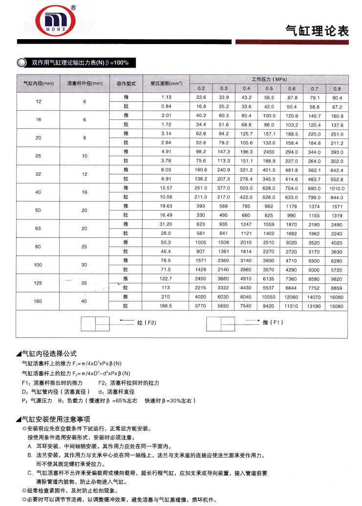 MOHE CYLINDER 气缸理论出力表